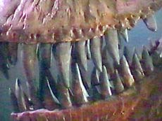 Das sind die Zähne vom T-Rex. Seine Zähne sind 20 cm lang.