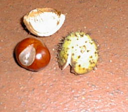 | Im Mai trage ich viele kleine Blüten. Sie bestehen aus grünen Kelchblättern, weißen Blütenblättern und orangefarbenen Staubbeuteln. Aus meinen Früchten kann ein anderer Kastanienbaum wachsen. Meine Früchte stecken in einer stacheligen Kapsel. Im Herbst springt die Kapsel auf und die Kastanie fällt zur Erde. Manchmal isst ein Eichörnchen die Kastanie. |